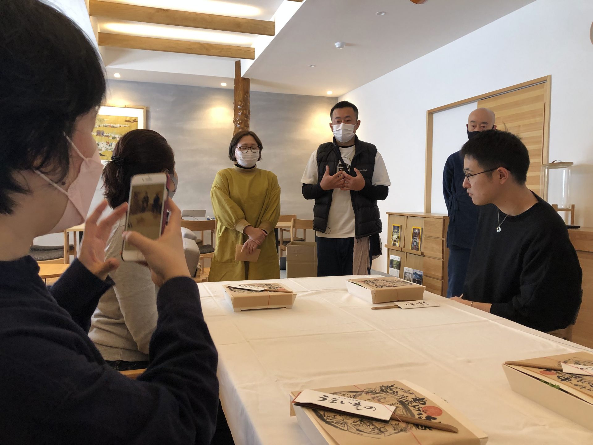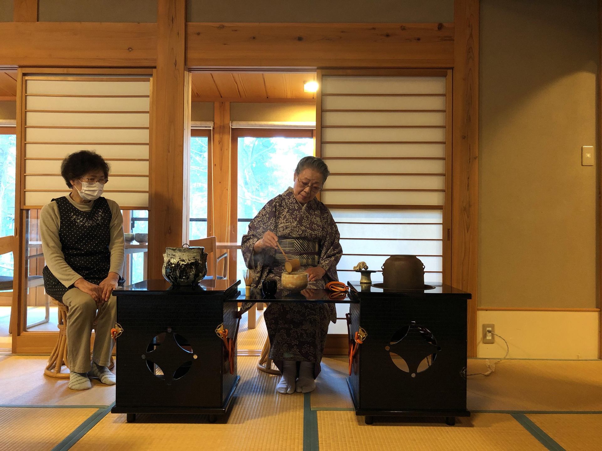 午後は旅館大沼・大女将による「茶道体験」。参加者全員で大女将のレクチャーを受けながら、お茶と茶菓子をいただきます。お茶が出されたら上座の方に一言「ご相伴いたします」と声をかけてからいただくなど、茶道の細やかな心遣いに触れ、日本文化の美しさを改めて感じる時間でした。