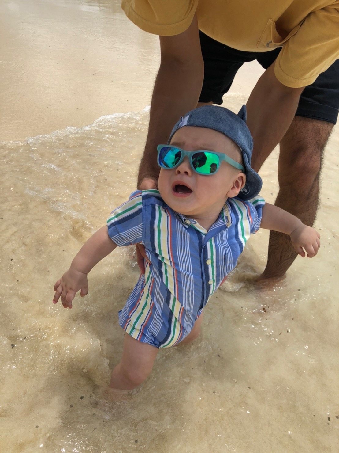 このビーチで息子は海水浴デビュー。まだまだ慣れないようでこの表情でした。