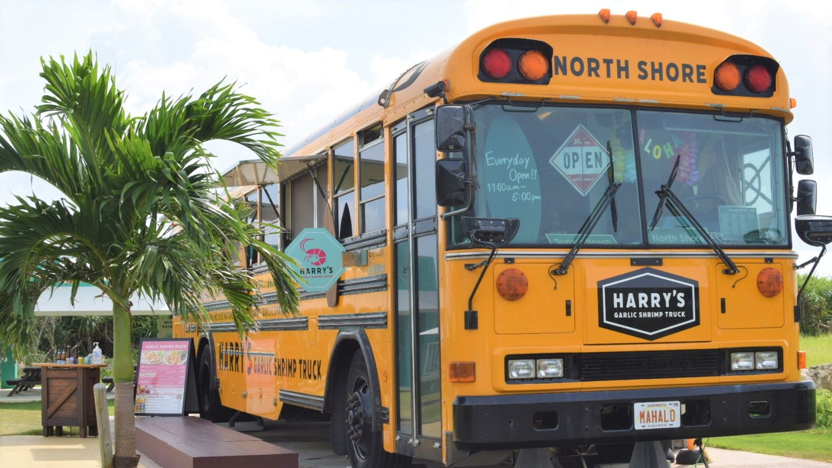 ランチは宮古島北部、西平安名岬にあるガーリックシュリンプのお店へ。アメリカンなバスが目印で、ハワイのガーリックシュリンプを研究し、宮古の素材を活用して今の絶品ガーリックシュリンプになったそうです。開放的で雰囲気も抜群。