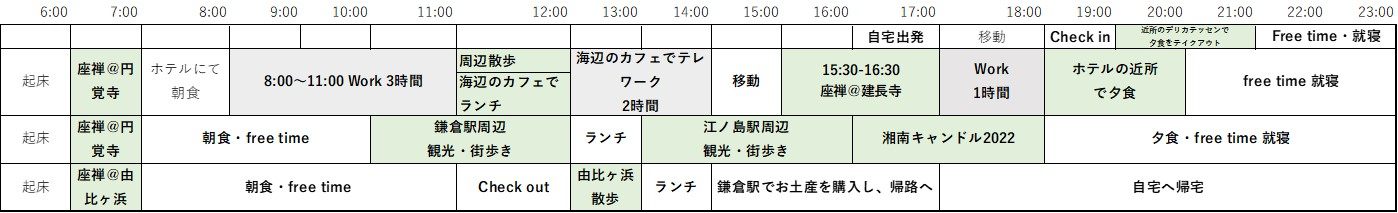 今回は、自宅・勤務先がある東京から近い鎌倉にてワーケーションをしましたが、「日常」=仕事と生活と「非日常」=旅、家族との時間、のどちらも楽しむことができました。また、ワーケーションで「暮らすように旅をする」ことにより、その旅先の知らない一面を感じることもできます。仕事×旅で、うまくスケジュールを立てることは難しそうに思えるかもしれませんが、ワーケーションをしたからこそ挑戦できること、心に残ることもあると思います。