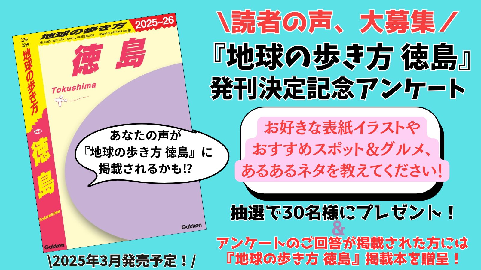 『地球の歩き方 徳島』の制作決定を記念し、2024年7月3日より発刊決定記念アンケート&プレゼントキャンぺーンがスタート。『地球の歩き方 徳島』の表紙を飾るイラストやおすすめスポット&グルメ、ご当地あるあるネタなどについて、徳島県民をはじめ、徳島が最近気になる読者の生の声を大募集しています。お寄せいただいた貴重なご意見や体験談が『地球の歩き方 徳島』に掲載された場合、掲載本を贈呈。また、アンケートにお答えいただいた方の中から抽選で30名様に、地球の歩き方オリジナルクオカードなどのプレゼントが当たります。