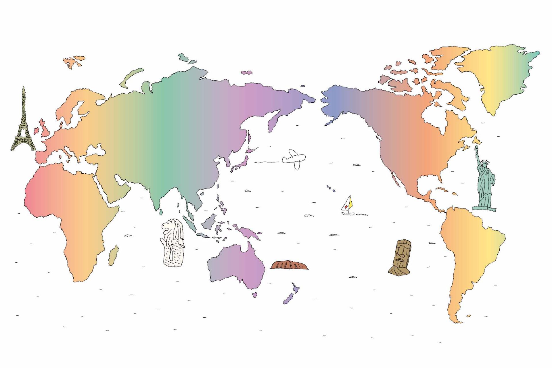 手描きの「世界地図」は国境など関係なく世界平和を願って描かれています。「地球の歩き方」のカバーデザイナーによる描き下ろしイラストによる商品化は3COINS が初めてで、貴重なデザインです。グラデーションカラーがきれいな、このマップデザインは、「PC/タブレットケース」や「ポーチ」などに起用しました。