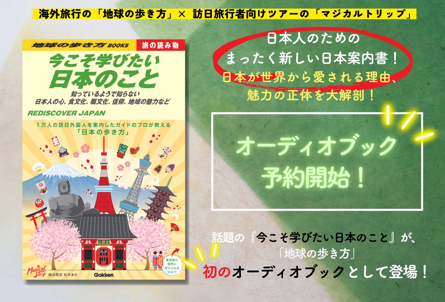 「日本の魅力を改めて知ることができた!」「子どもに読ませたい!」など、話題の『今こそ学びたい日本のこと』が、「地球の歩き方」初オーディオブックとして登場! 2024年7月24日よりAmazonオーディブル(以下、Audible)で予約開始しました(2024年8月8日(木)配信開始)。Audible会員なら聴き放題で楽しめます!