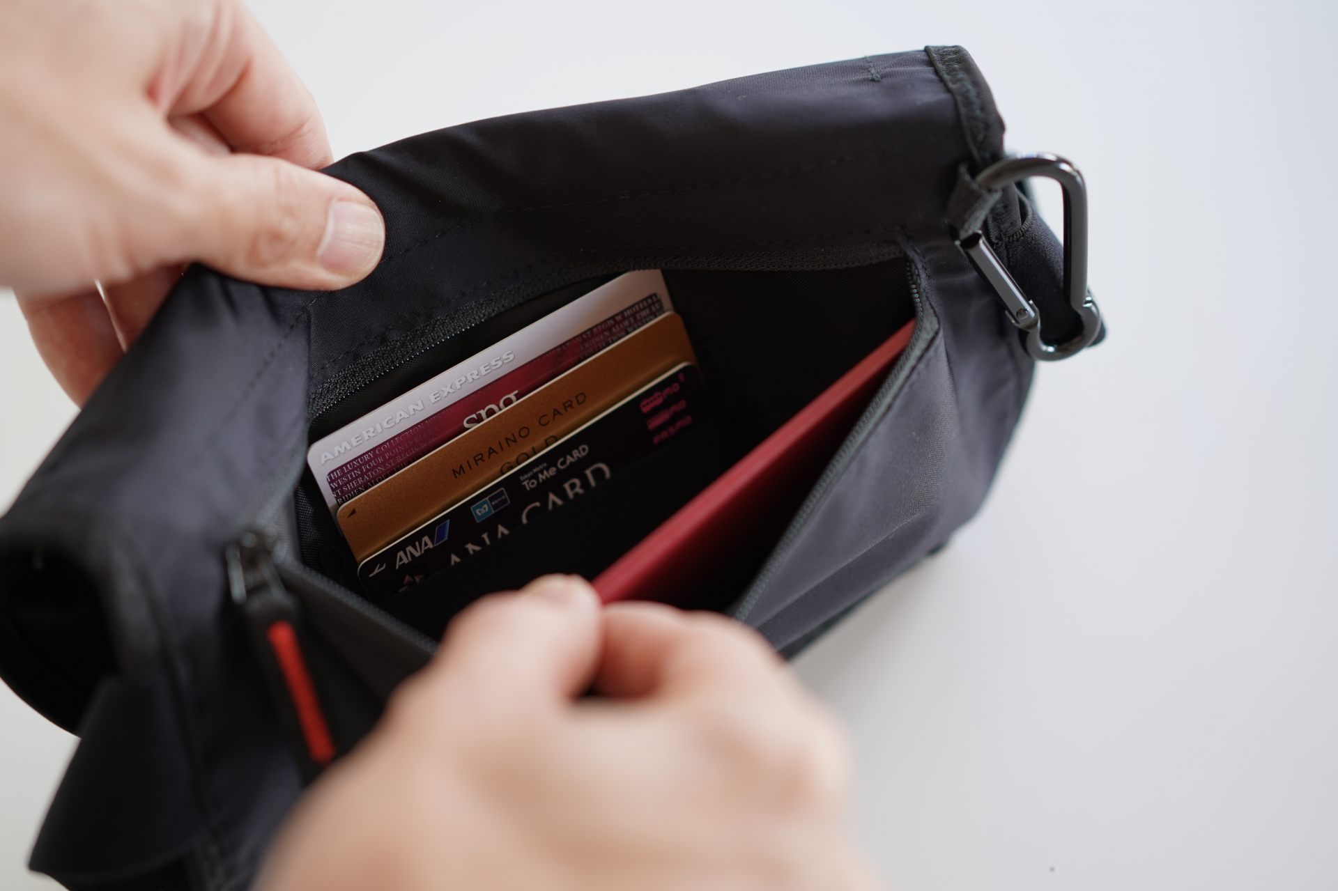 コンパクトな見た目ながら、ひとつのポーチで全3つのポケットを搭載。メイン・フロント・背面のメッシュポケットとあり、必要最低限の貴重品が十分に入るスペースと大きさです。取材中もほとんどの貴重品をセキュリポに入れて行動することができました。