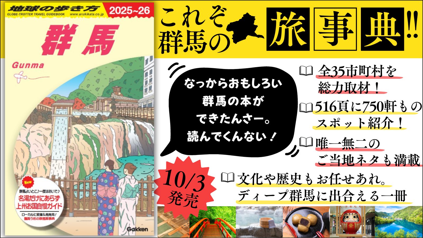 2024年10月3日より『地球の歩き方 群馬』が全国書店およびオンライン書店で発売! 山あり、町あり、温泉あり。そんな群馬のポテンシャルあふれる観光名所たちや、知られざる歴史や文化を紹介するこの一冊。読めば、もっと群馬が好きになり、もっと群馬を旅したくなること間違いなし!