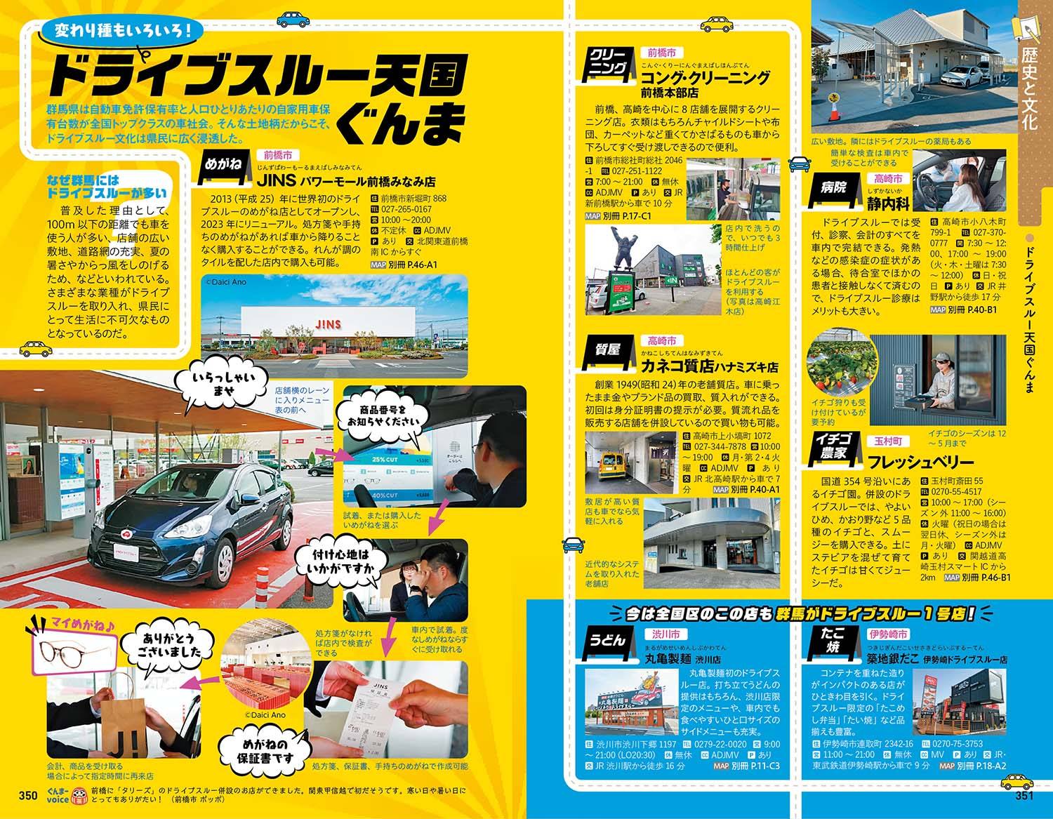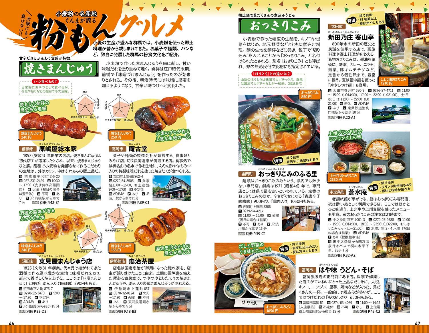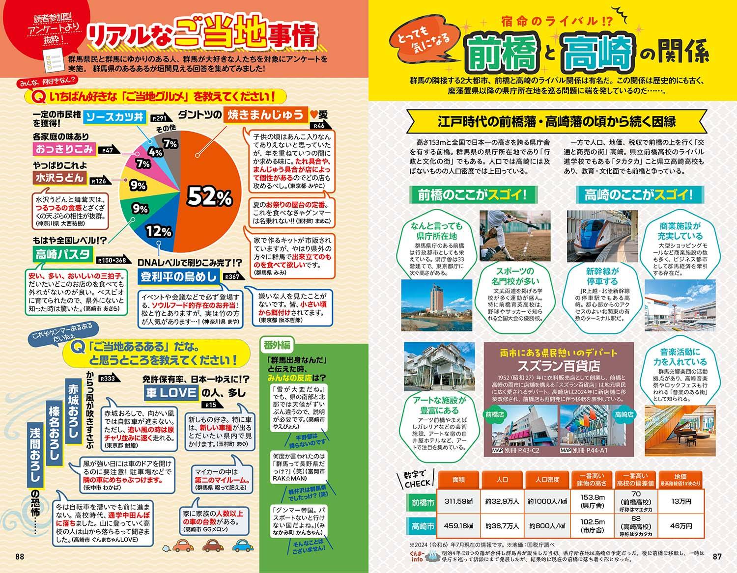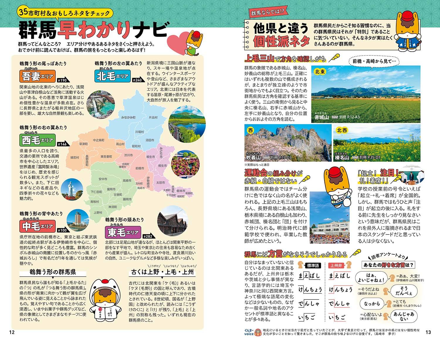 他の県とは異なる風習・文化を深掘りし、群馬県民のアイデンティティにも注目。「上毛三山で方角を確認しがち」だったり、方言がないと思っているが実はしっかり上州弁を話しているなどなど、意外と住んでいると気づかない群馬ならではの個性的な情報をしっかりピックアップ。群馬あるあるなど、リアルな読者の声から作ったページは読みごたえたっぷり。