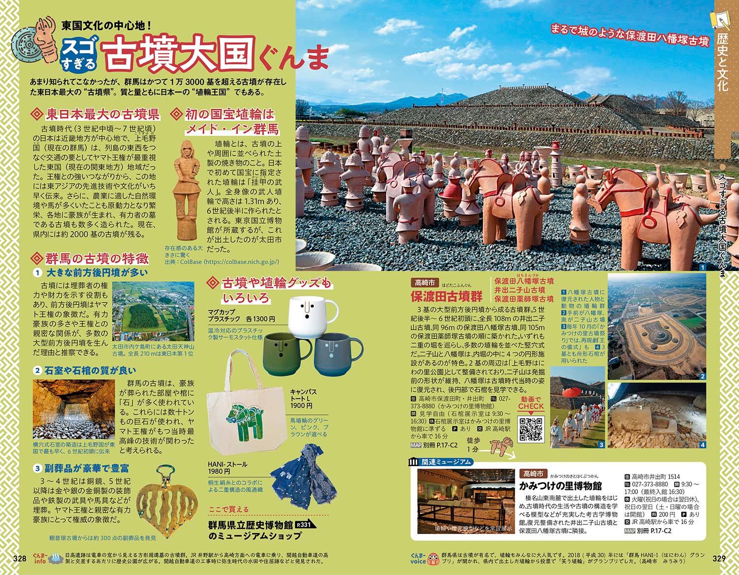 地球の歩き方国内シリーズで好評を博しているのが、ガイドブックでは珍しい「歴史」や「文化」の特集です。群馬の年表や群馬を語るうえで欠かせない古墳についてなど、地元の方にとっても“新”&“深”発見があるように、歴史や文化の紹介を充実させています。古来から続く群馬の魅力を発見できるはず。