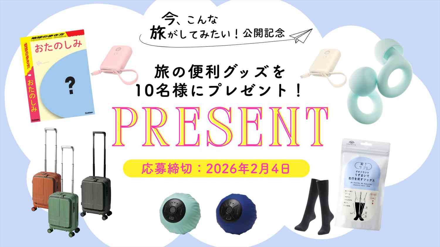 「今、こんな旅がしてみたい!」特集の公開にあわせて、2026年2月4日(水)まで豪華プレゼントキャンペーンを実施。スーツケースや小型家電、雑貨など、旅行の便利グッズを抽選で10名様にプレゼント。ぜひご応募ください!