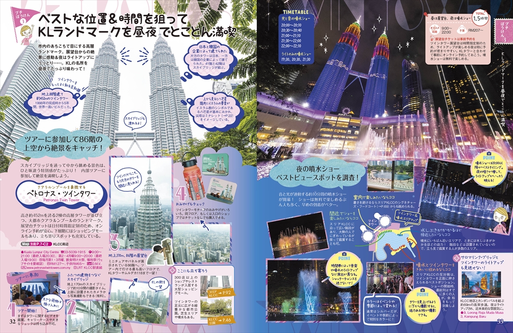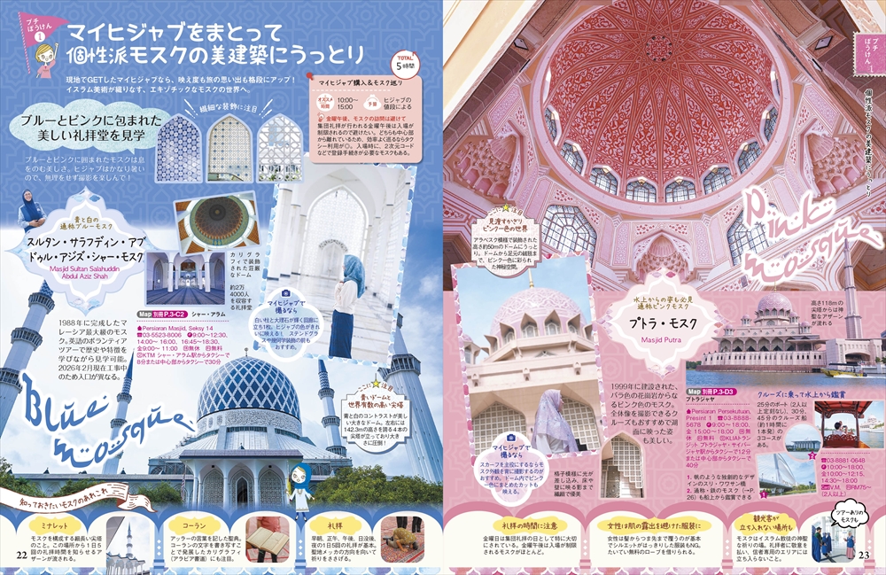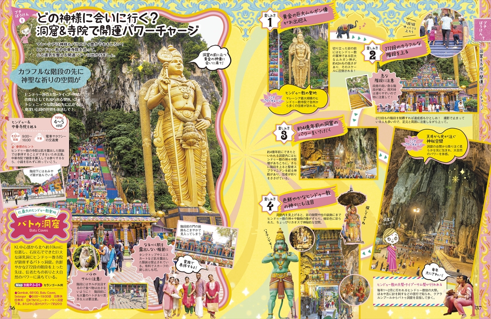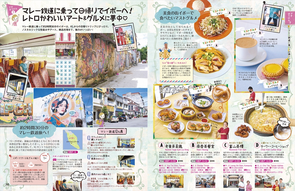 クアラルンプールで絶対に行きたいピンクやブルーが印象的なモスクや、繊細な装飾が特徴の建築など、思わず写真を撮りたくなるスポットを紹介。さらに、巨大な黄金の神像で知られるバトゥ洞窟などのパワースポットや、フォトジェニックなチャイナタウンの町歩きもピックアップ! マレー鉄道に乗っていく美食の町イポーや、紅茶がおいしい高原キャメロンハイランドへのショートトリップ特集も必見です。