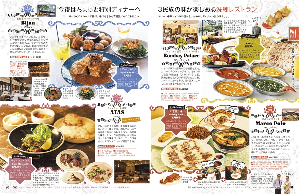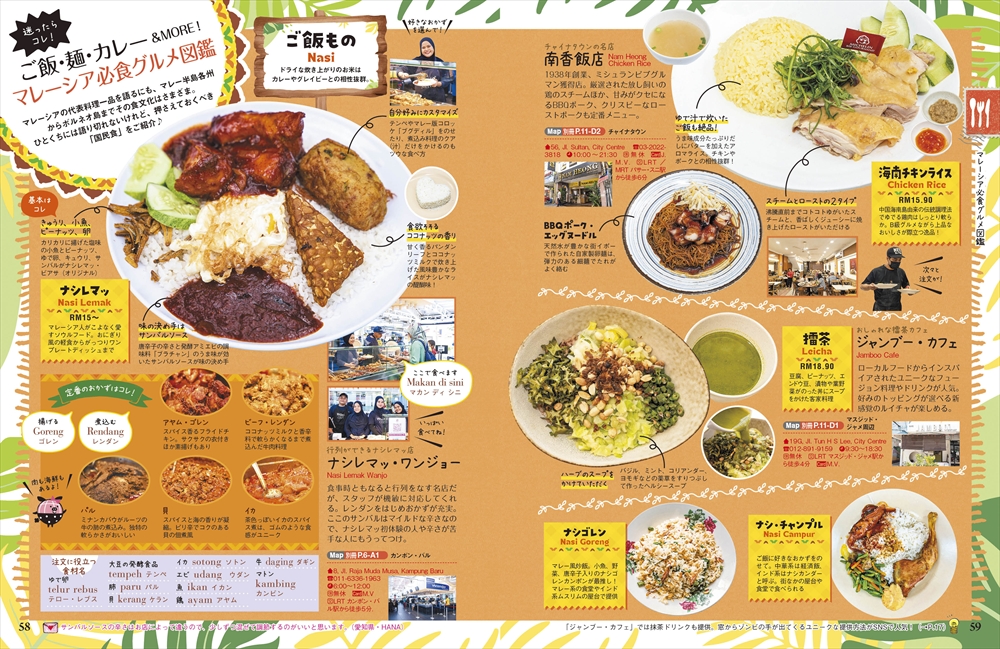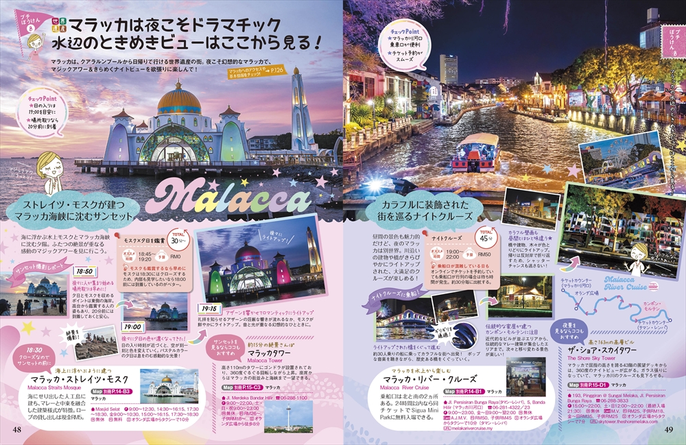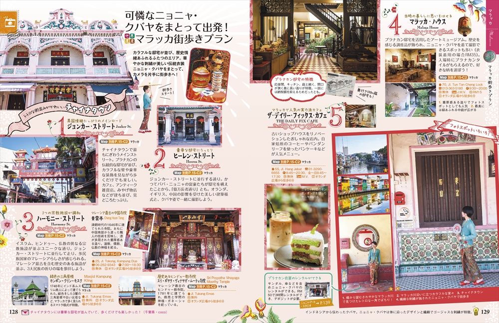 世界遺産の町マラッカでは、カラフルな建物や歴史ある教会、異国情緒あふれる町並みの散策が楽しめます。伝統のニョニャ料理や地元で愛される名物食堂、プラナカンの世界を堪能できる博物館など、マラッカならではの魅力を10ページ以上にわたってたっぷり紹介しています。