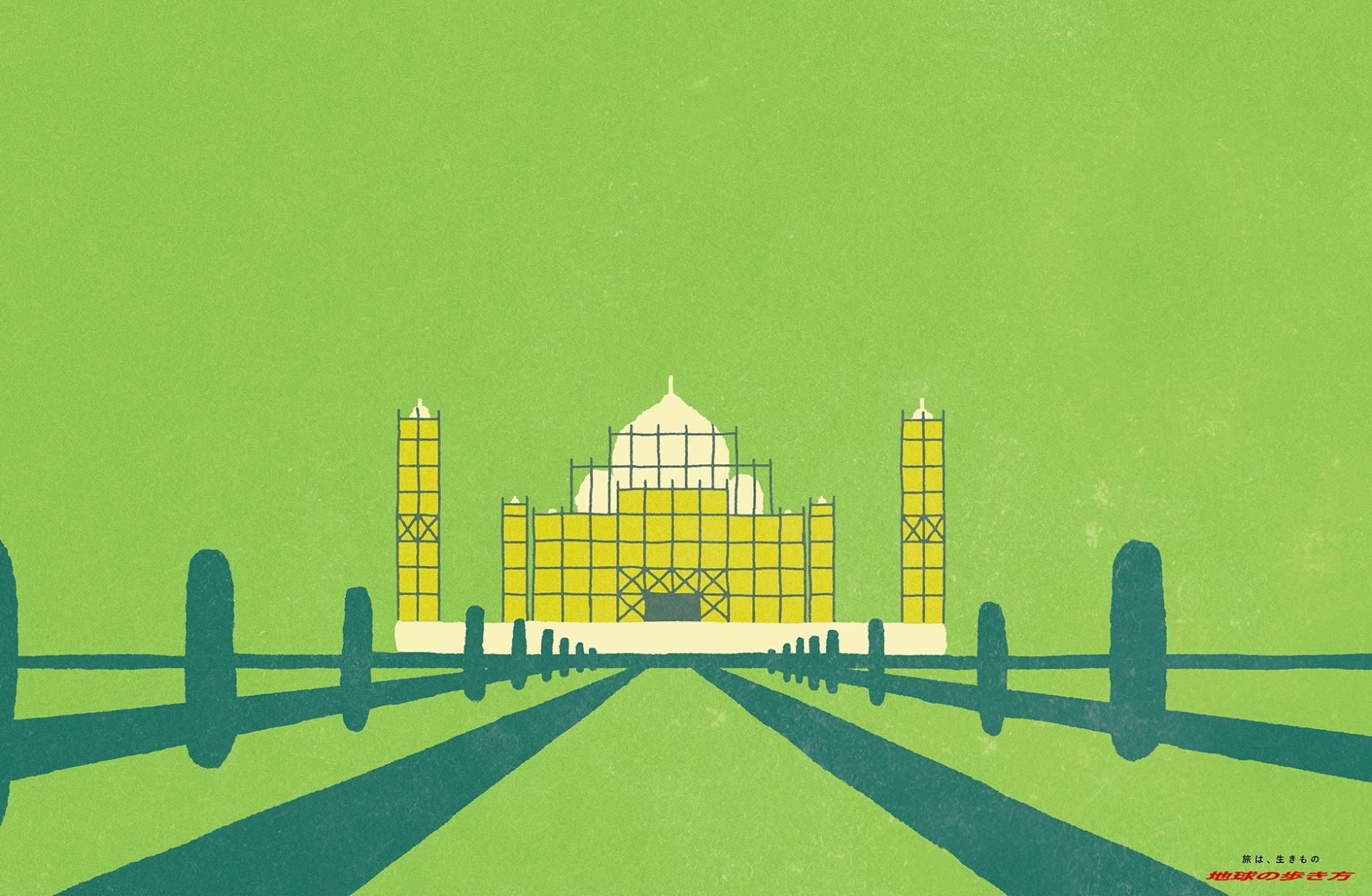 “旅に出るか迷う若者たちの背中を押し、「旅ってリアルだ」を伝えながら旅人に寄り添う「地球の歩き方」の世界観を表現してください”というお題に対して、「SNSを見て旅をすると確認作業になってしまう。むしろ世界遺産を見に行ったら工事中だったとか、ロスバゲに遭ったとか、帰国後に居酒屋で話のネタになるようなトラブルのほうがおもしろい」と石原さん。制作にあたって砂田さんは、「省略した表現でシンボリックに描いてもわかりやすい世界遺産を選び、トラブルとの組み合わせを考えた」といいます。