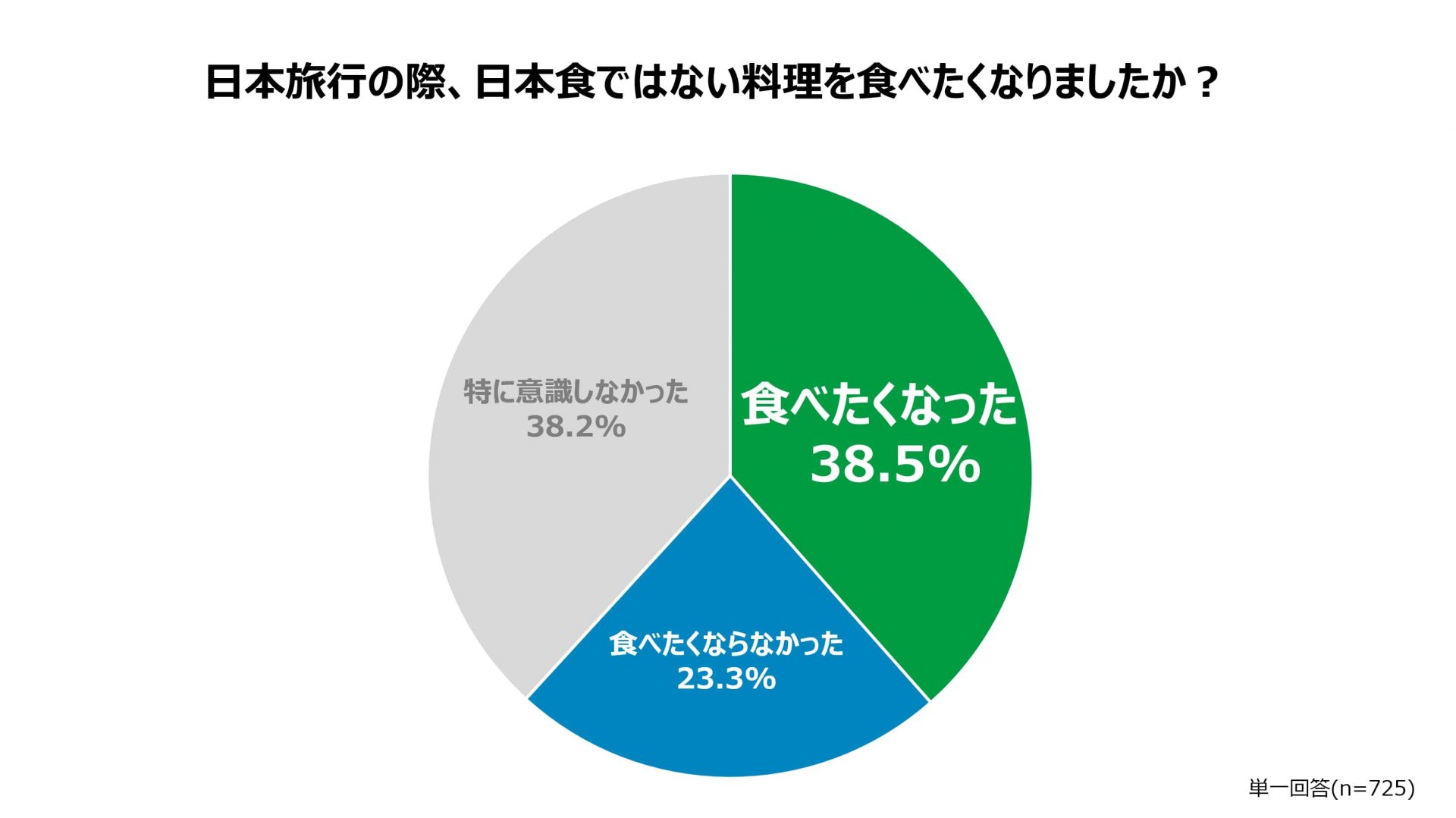 それを確認するため、「日本旅行の際、日本食ではない料理を食べたくなりましたか?」と質問したところ、「食べたくなった」が最も高い回答割合で38.5%でした。次は「特に意識しなかった」で38.2%、「食べたくならなかった」は最も低い23.3%でした。