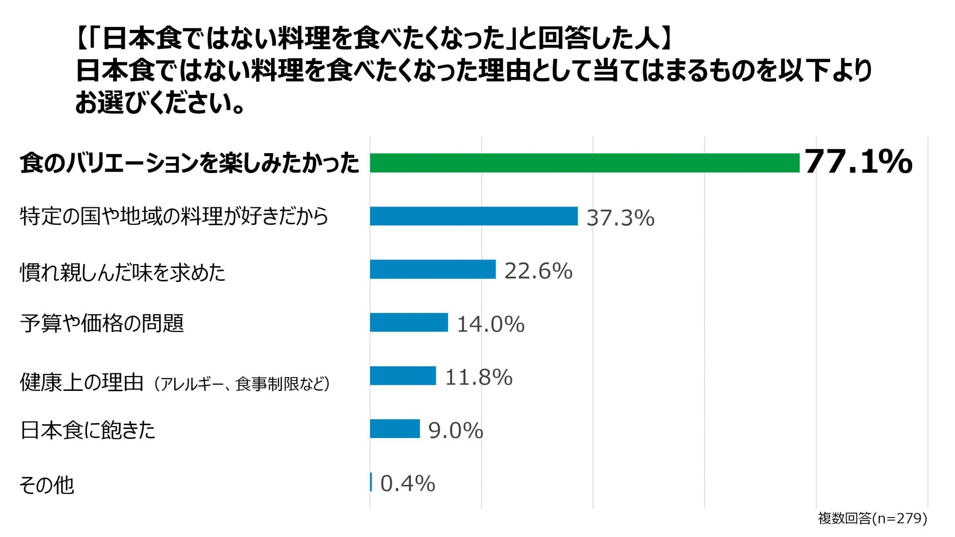 前問で「日本旅行の際、日本食ではない料理を食べたくなった」と回答した279人に、その理由として当てはまる項目を選んでもらいました。最も多く選ばれた項目は、「食のバリエーションを楽しみたかった」の77.1%であり、次点の「特定の国や地域の料理が好きだから」(37.3%)の約2倍の回答割合でした。調査結果から、日本で体験できる日本以外の国の料理にも訪日外国人は高い興味を示していることが分かりました。
