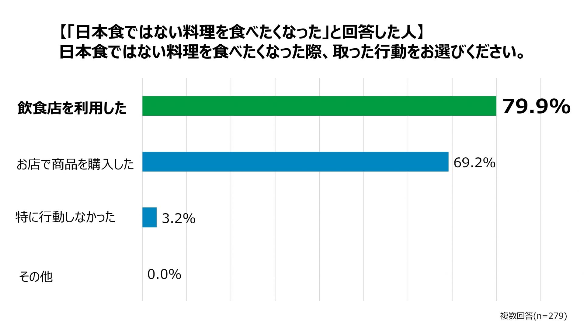 「日本食ではない料理を食べたくなった際、取った行動をお選びください。」という質問の結果、「飲食店を利用した」が79.9%、「お店で商品を購入した」が69.2%で、大きく差がない結果となりました。日本では、他のいくつかの国とは異なり、コンビニエンスストアで手軽に様々な国の料理を購入できる点も影響していそうです。