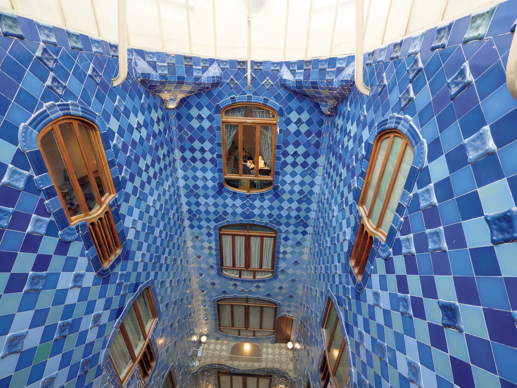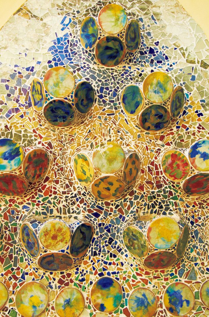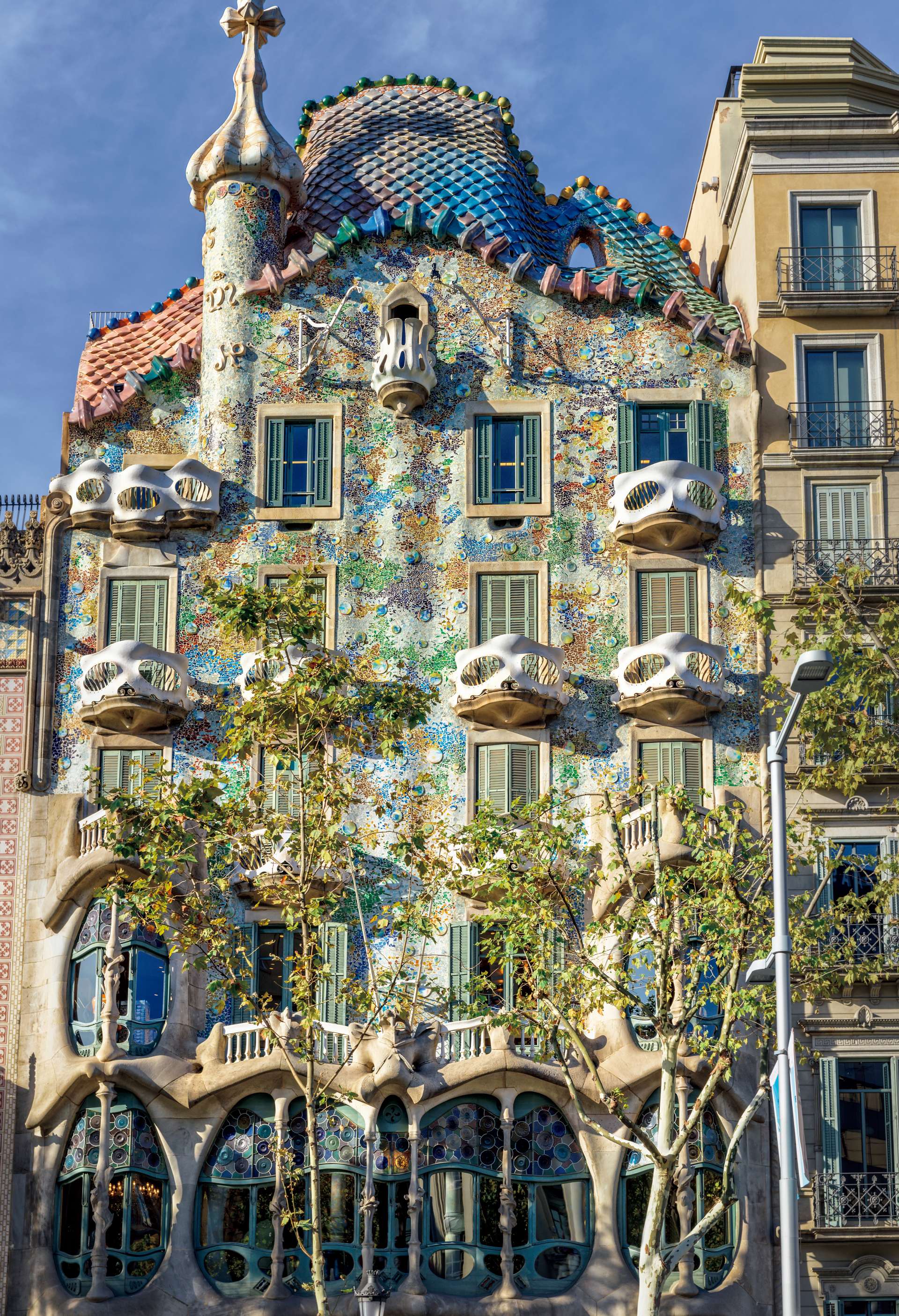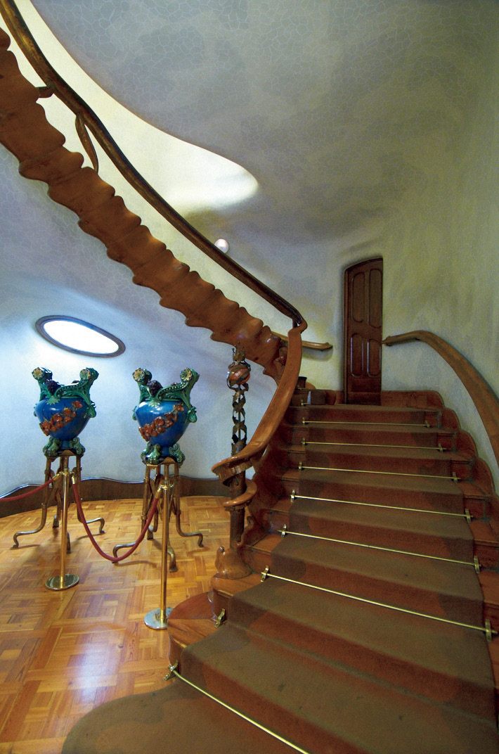カサ・バトリョは、鮮やかな色合いと流れるようなデザインが際立つ建物であり、ガウディが手がけた作品の中でも特に華やかで有名だ。海をテーマにしたこの建物は、ガウディが増改築を行ったものである。外観にはカラフルなタイルが敷き詰められ、優美な曲線が印象的だ。内部へ進むと、自然光を巧みに取り入れた空間が広がり、階段や窓枠、ドアノブまでが曲線でデザインされている。また、屋上も訪問者に開放されており、独自の景観を楽しむことができる。