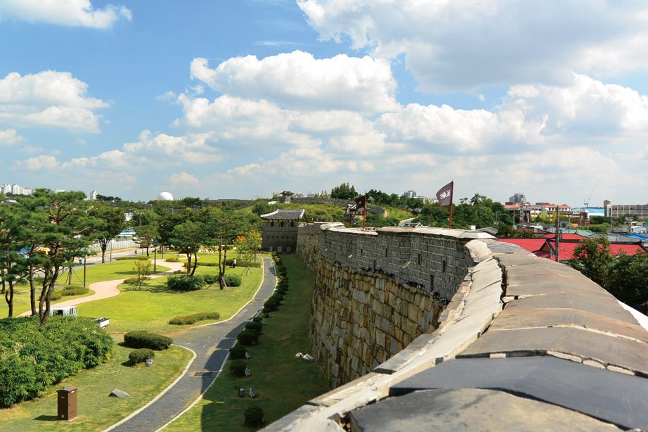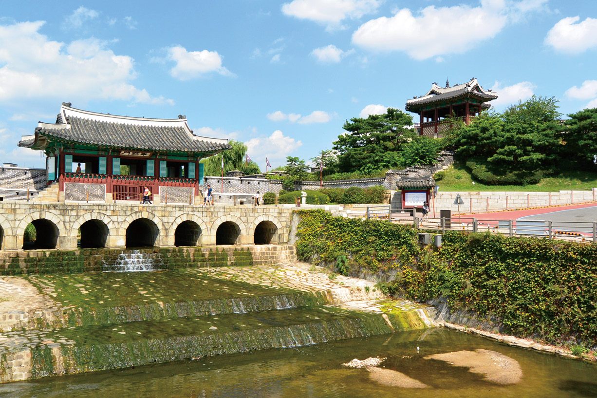 水原華城は、朝鮮王朝22代王正祖が、父、思悼世子を悼み、その墓を水原に移した際に築いた城壁や城門。正祖は完成後、遷都する意向であったと伝えられるが、城郭の完成直後に亡くなり、遷都は立ち消えとなり幻の都となった。朝鮮古来の築城法に、石とレンガの併用といった西洋の近代的な建築技法でできた水原華城は高い価値を有する城として世界遺産に登録されている。