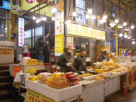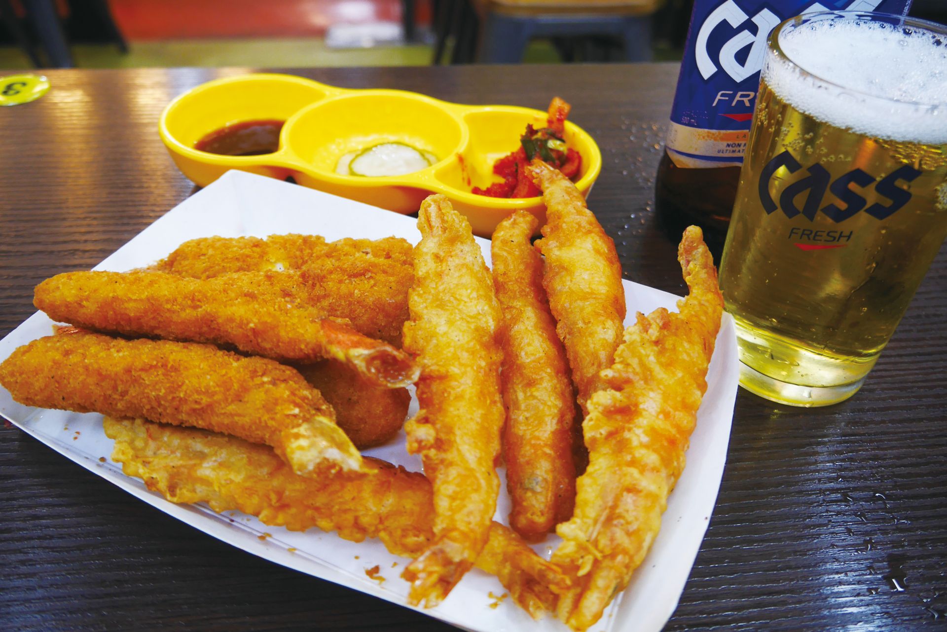 市場にある天ぷら専門店。オジンオスンデや大きな海老天ぷら、ベニズワイガニのフライ(いずれも1人前W1万)、などが人気。盛り合わせセットもある。海老天ぷらは大きさが選べる。