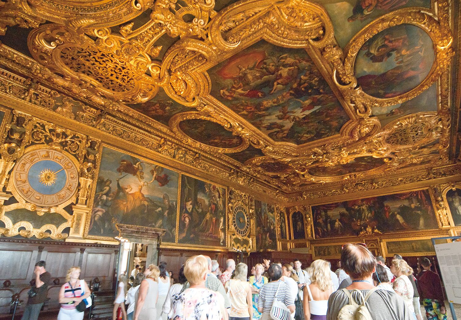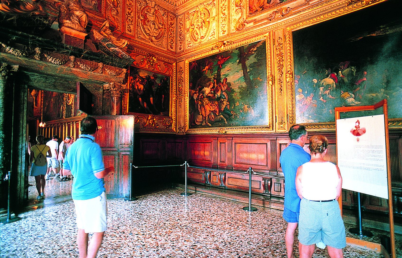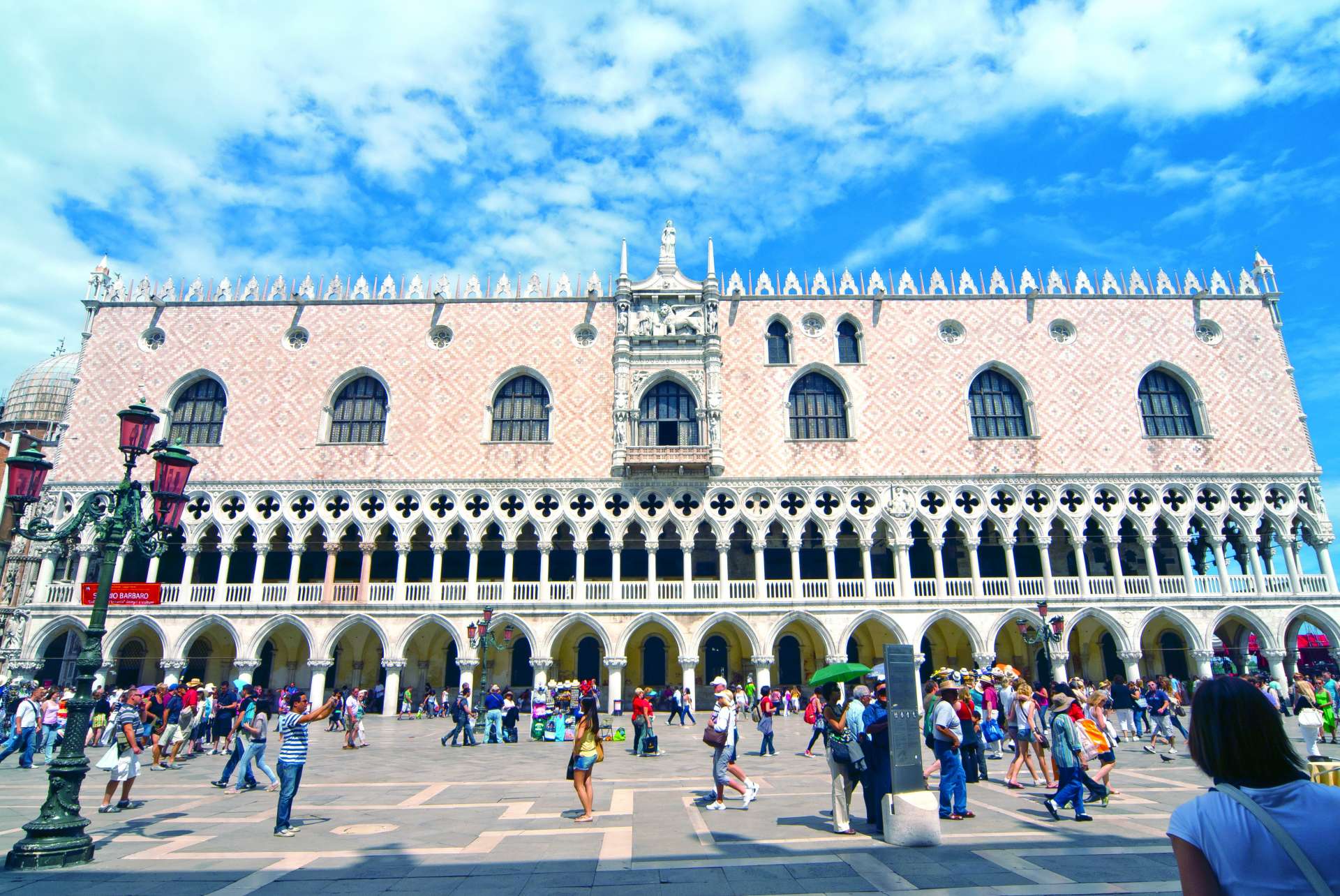 ドゥカーレ宮殿は、ピンクと白の大理石が美しい印象を与える建物で、かつてヴェネツィア共和国の総督が政務を執った場所である。この宮殿では国会、行政、裁判が行われており、内部に足を踏み入れると、豪華な装飾や大評議の間の壁に描かれた巨大な絵画に圧倒される。さらに、宮殿の対岸には牢獄が存在し、溜息の橋によって結ばれている。
