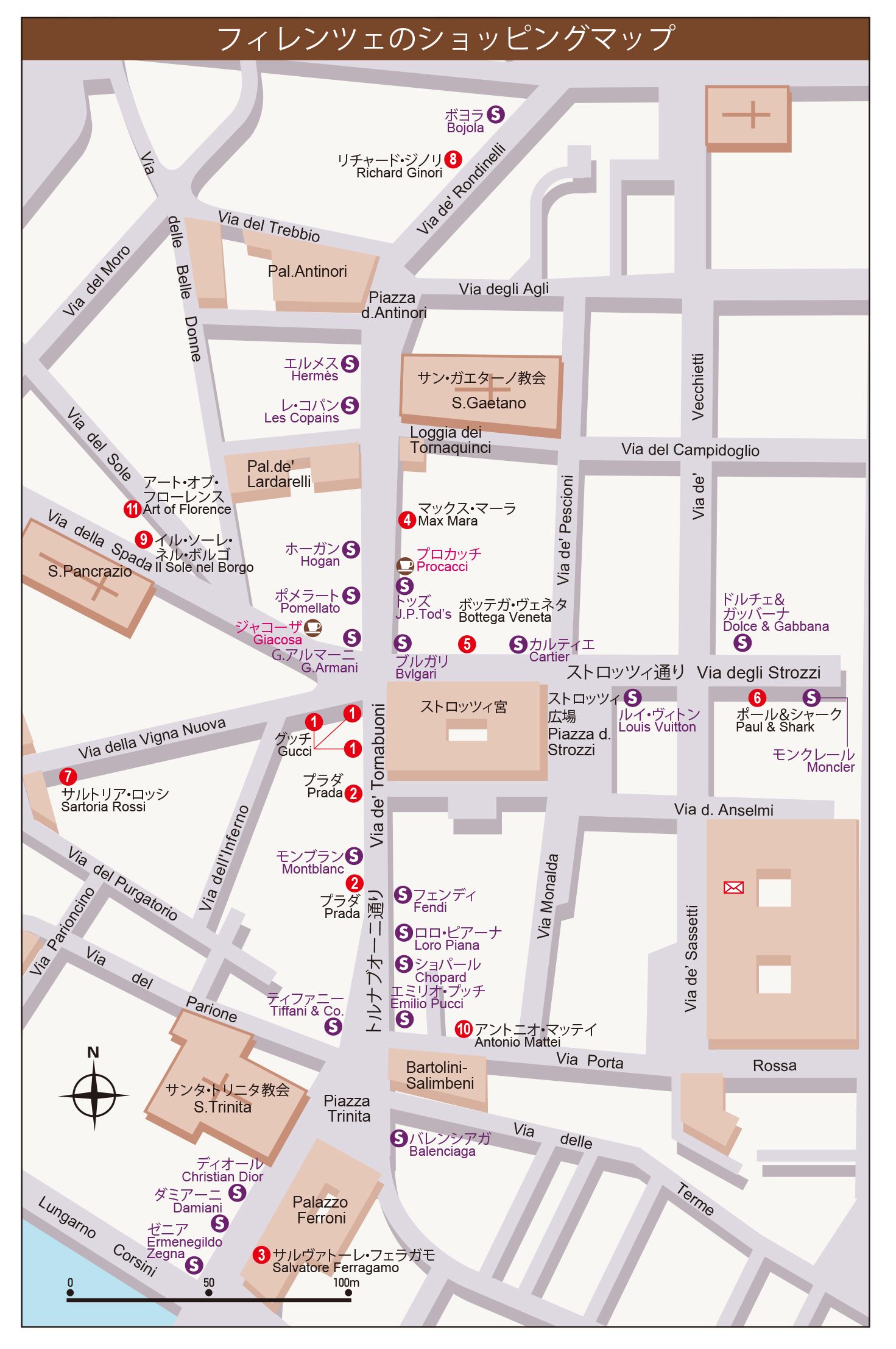 フィレンツェを代表するブランドストリートはトルナブオーニ通り。車の通行が制限され、そぞろ歩きが楽しい。通りの中ほどのストロッツィ宮の左右の通りにも有名店が並び、ヴィーニャ・ヌオーヴァ通りにはメンズブランドが多いので、男性必訪。共和国広場へ向かうストロッツィ通りはウインドーディスプレイが華やか。さらにストロッツィ通りを進んだカルツァーイ通りにはブランドショップやデパート、ZARAなどが並び、このあたりはカジュアルブランドが多い。