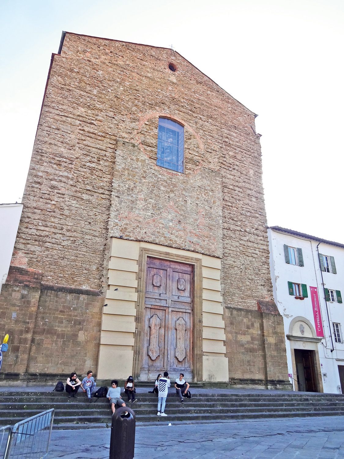 サント・スピリト教会前の広場を抜け、右にサンタゴスティーノ通りVia Sant'Agostinoを通り、次の目的地のサンタ・マリア・デル・カルミネ教会へ向かおう。道は途中でセッラリ通りVia de' Serragliと交差するが、道を横断してサンタ・モナカ通りVia S. Monacaを進めば大きな広場へいたる。広場左側に建つのが、S.M.デル・カルミネ教会だ。