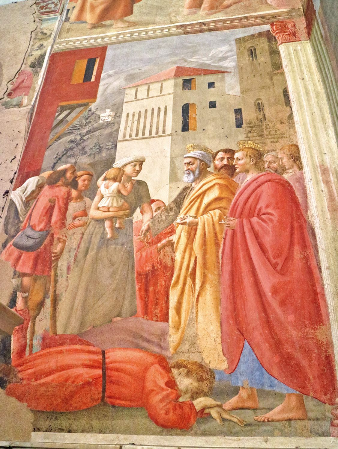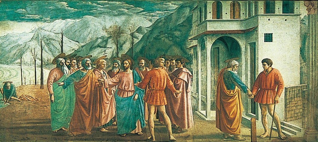 絵画表現において数々の革新をなし遂げたジョット(1266~1337年)の時代から約1世紀。当時の絵画の主流は、そのジョットの色彩や装飾性に注目して発展してきたシエナ派や、国際ゴシック様式だった。たとえば、G.ダ・ファブリアーノの『三賢王の礼拝』が描かれたのは1423年、マザッチョがブランカッチ礼拝堂で制作を開始する直前のことである。マザッチョがジョットから受け継ぎ発展させたのは、必要な要素をえりすぐることで「描かれる事件」の精神的な緊張と造形的な調和を極限まで追求する、という姿勢だった。後にヴァザーリが書いた『芸術家列伝』では、レオナルド・ダ・ヴィンチ、ミケランジェロ、ラファエッロなどの大家も、若い時にこの礼拝堂に足しげく通ってマザッチョの画面を研究したと述べられているが、このことからも彼の革新がその後のルネッサンス美術にとってどれほど重要であったかがうかがい知れる。