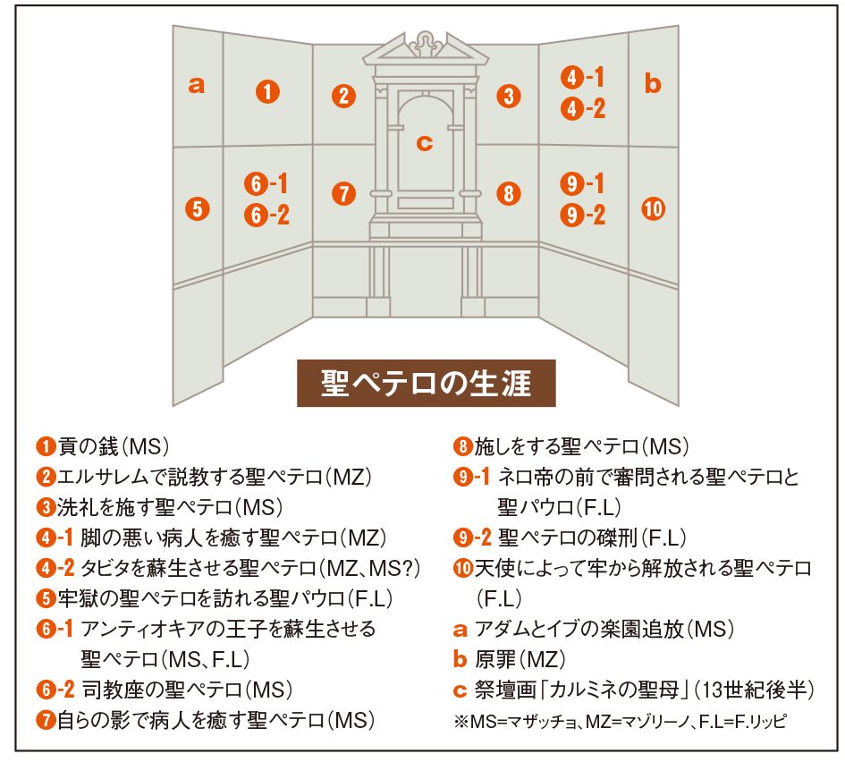 フレスコ画のテーマは『聖ペテロの生涯』で、祭壇に向かって右の端のマゾリーノによる『原罪』の画面から始まっている。それに相対する左の端上段の画面はマザッチョによる『アダムとイブの楽園追放』Cacciata dal Paradiso Terreste、その隣も彼の手になる『貢の銭』Pagamento del Tributoで、どちらも絵画史上に名を残す名画面である。さらに、祭壇右下の壁面『施しをする聖ペテロ』と左下の『自らの影で病人を癒す聖ペテロ』もマザッチョが描いた物だ。一方、祭壇のすぐ左隣上段の壁面はマゾリーノの『エルサレムで説教する聖ペテロ』である。右側の上段中央には同一壁面の中に、「使徒行伝」からの2場面がマゾリーノとおそらくマザッチョの手で描かれている。その下の壁面にも同様に聖ペテロの行いを描いたふたつの場面があるが、これはフィリッピーノ・リッピの作品だ。リッピは左右両端の下段の壁面に『牢獄の聖ペテロを訪れる聖パウロ』、『天使によって牢から解放される聖ペテロ』をも描いている。左側下段中央にもふたつの場面が描かれているが、そのうち左の『アンティオキアの王子を蘇生させる聖ペテロ』はマザッチョが未完のままに残したため、あとをF.リッピが完成させた。なお、祭壇に飾られた『カルミネの聖母』は13世紀後半の物である。
