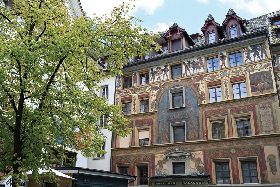 中央駅から徒歩約10分。旧市街の真ん中に位置し、観光に便利。外壁いっぱいに美しいフレスコ画が描かれている。室内はモダンでシンプルな造り。約半数の部屋はロイス川に面していてカペル橋も見える。併設のレストランは、ロイス川を望むテラスからの眺めがすばらしく、料理の評判もよい。