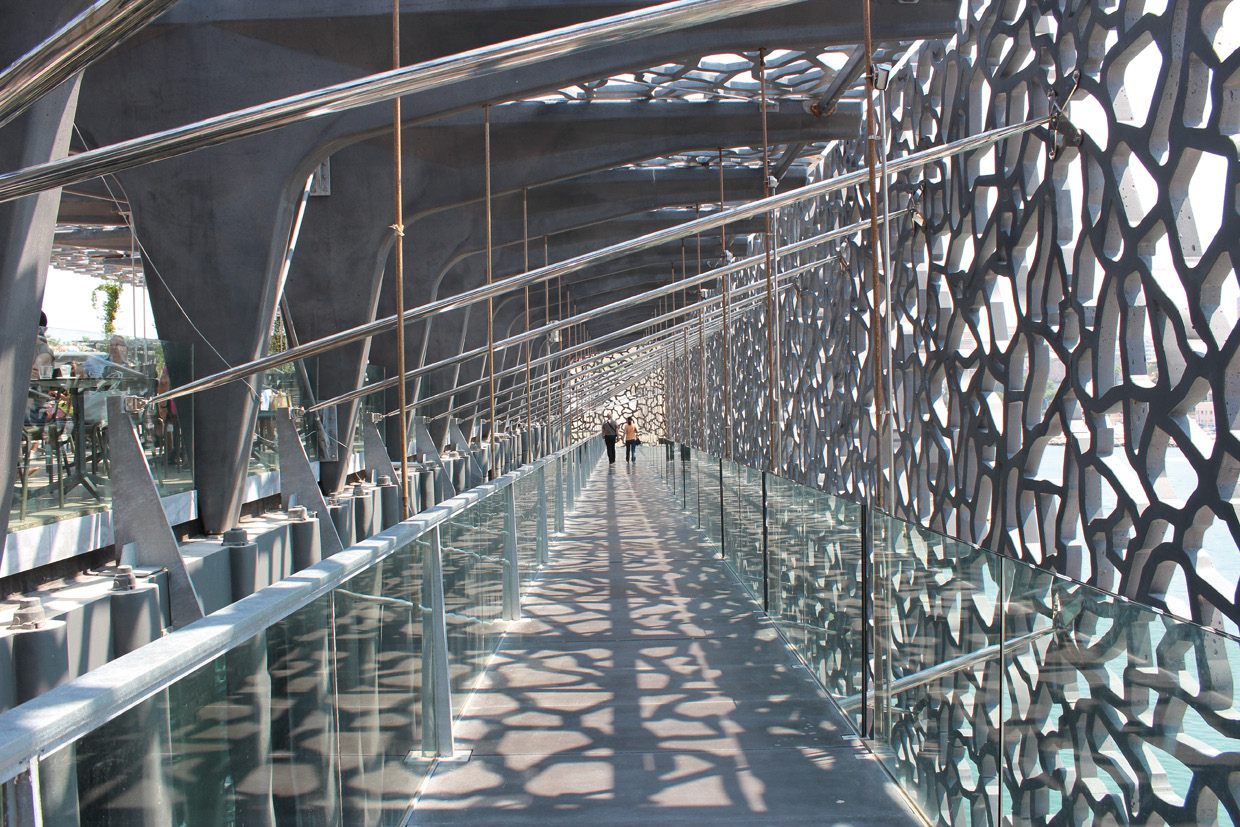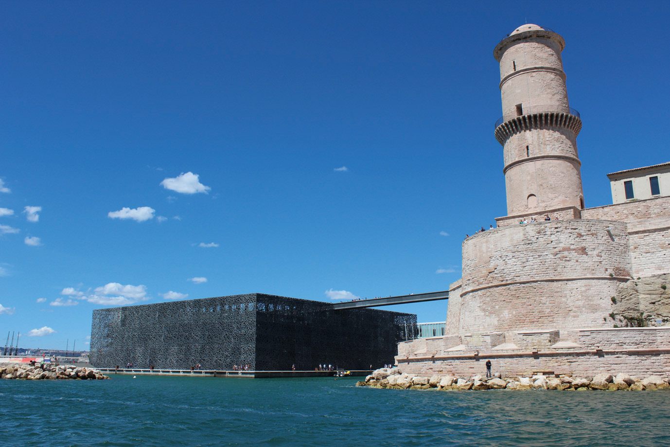 ヨーロッパ地中海文明博物館(MuCEM)は、地中海世界の文化や歴史を深く掘り下げた展示で知られる博物館。アルジェリア出身の建築家リュディ・リチオッティによって設計されたモダンな外観が印象的で、細かな網目模様の外壁はコンクリートでありながら非常に繊細です。博物館は海と港を見渡す絶好のロケーションにあり、その独特なデザインは訪れる人を魅了します。建物の屋上からは、マルセイユの港と海の壮大なパノラマビューが広がり、観光の合間にリラックスするのにぴったりです。
