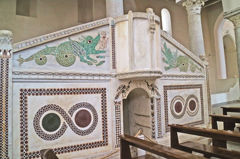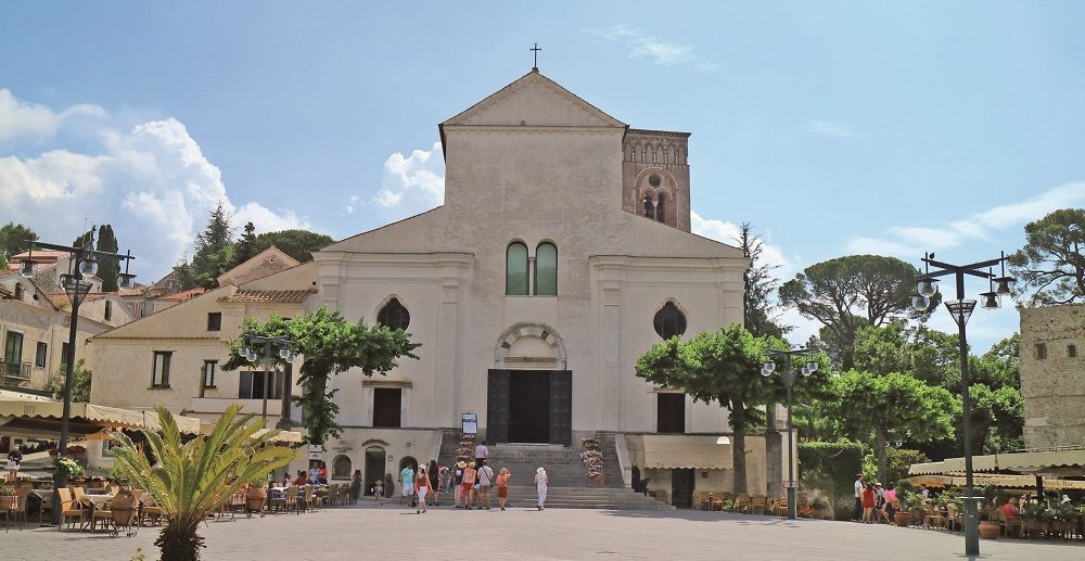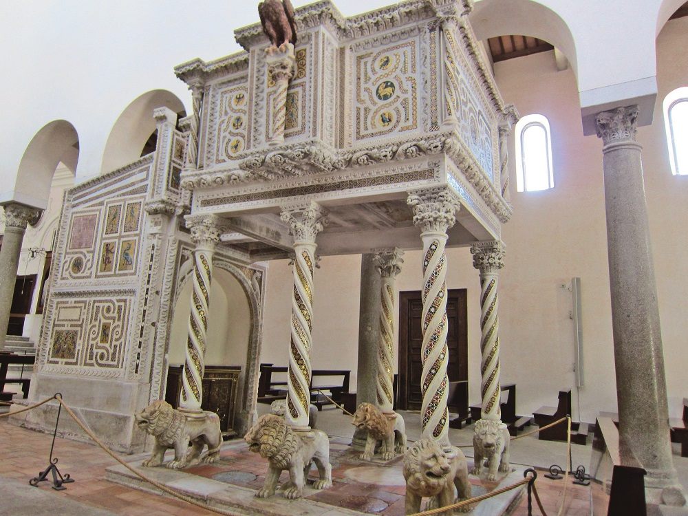 カフェがテーブルを広げる伸びやかな広場の一角に建つ。11世紀に町の守護聖人を祀るために建立されたもので、正面のブロンズ扉はアマルフィのドゥオーモと同じく12世紀にコンスタンティノープルで鋳造された物。内部は3廊式でとりわけ目を引くのが2つの説教壇。
