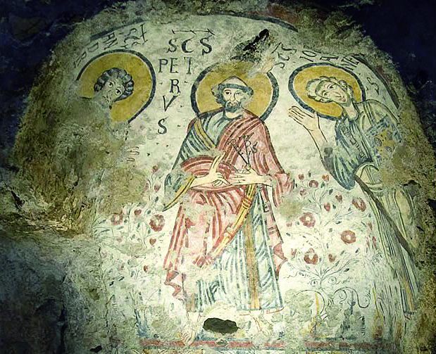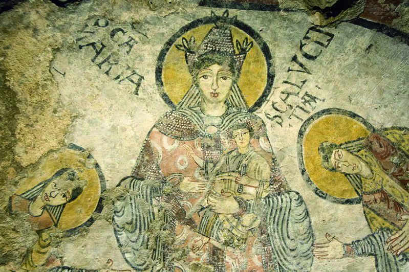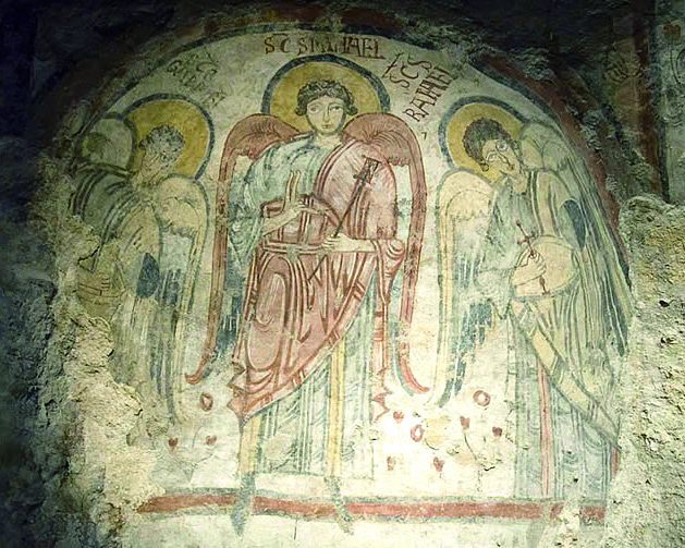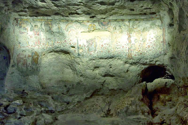 マテーラ市内から約15㎞、ブドウ畑を抜けると、緑深いピッチャーナ渓谷に到着だ。この険しい渓谷の隠れるような洞窟に「原罪のクリプタ」がある。南イタリアにおける最古の洞窟壁画で、ベネヴェントにロンゴバルト族が栄えた8世紀から9世紀に、かの地から逃れた僧たちにより描かれたといわれている。