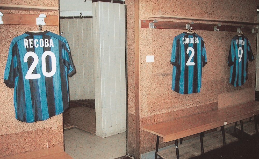 インテルもミランも どちらのチームのグッズも揃う。試合日はプレーするチームのグッズが中心。