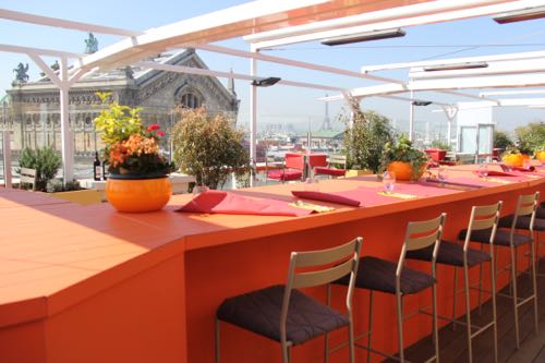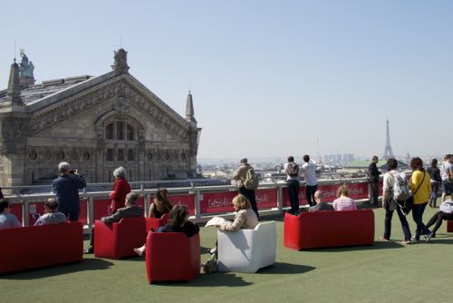 それはギャラリー・ラファイエット・パリ・オスマン店本館8階の屋上テラス。人工芝の上にベンチが置かれ、景色も抜群で休憩場所にぴったりです。夏季限定(4月15日〜10月15日)でインド料理店「La Porte des Indes(ラ・ポルト・デ・ザンド)」も出店し、食事もできます。