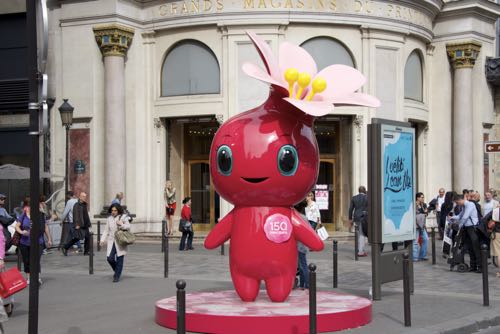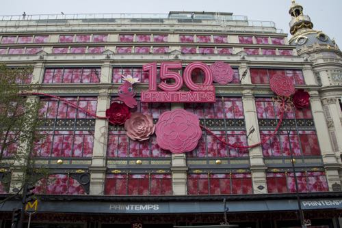 ラファイエットのお隣、プランタンも春仕様。外観は花で彩られ、150周年を記念した装飾になっています。表にはイラストレータ・吉井宏氏によりデザインされた記念マスコットキャラクター「ローズ」も。パリは春です!