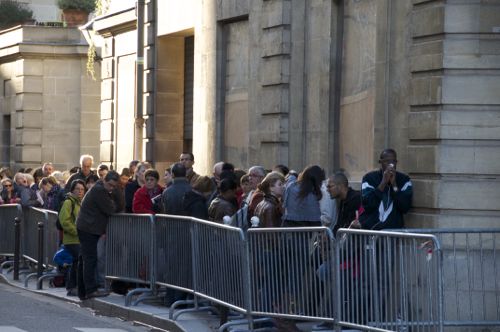 私は昨年、首相官邸(マティニョン館)、元老院(上院)、国防省、仏学士院、ソルボンヌ・リシュリュー礼拝堂に行きました。大統領府(エリゼ宮)や首相官邸などは人気の場所なので、開館前の朝早くから長蛇の列ができます。昨年の首相官邸前はこんな感じでした。
