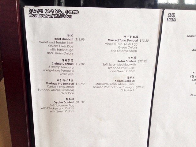 牛丼($11.99) 海老天丼($12.99) かき揚げ丼($11.99) 親子丼($11.99) ネギトロ丼($13.50) カツ丼($12.50) 海鮮丼($18.50)
