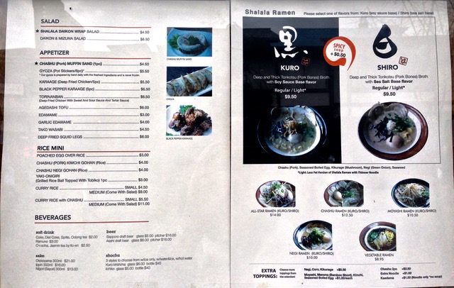 シャララ(Shalala) このラーメン屋さんもご飯としてメニューあって、チャーシューキムチ($4.00)チャーシューネギ($4.00)カレー($4.50)とやはりチャーシュー系ご飯。 一工夫して他店と差別化を図っている。 ランチは11時半〜2時ディナーは6時オープン。