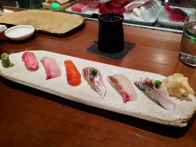 6Peace握り($38) マグロはすき身となるところの薄皮を剥がしてネタにしていてへぇ〜って感心。 カンパチ、鯛は食感がとってもよくて割合さっぱりだったし、適度なお酢が爽やかな鯖も美味しかった。
