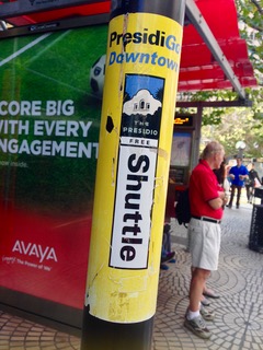 『プレシディゴー(PresidiGo)』は “プレシディオ内を巡るシャトルバス” と “ダウンタウンとプレシディオを結ぶシャトルバス” 時間によっては無料なので、その時間帯を利用して金融街のハイアットリージェンシー前のミュニバス停留所(ドラムDram St側)から乗車。