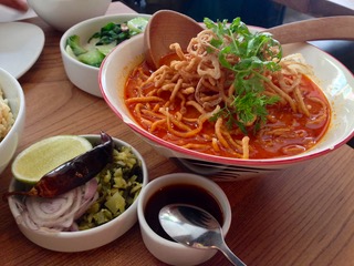カオ・ソイ・ゴイ(Khao Soi Gai$18)は、多分初めて食べた。 太麺を揚げてココナッツミルクベースのスープ。 タイ北部の汁麺。 試しにトンガラシ入れたり、高菜(風)の青菜、オニオン、ライムを絞ってみたりした。 こりゃ、クセになるヌードルスープだ。