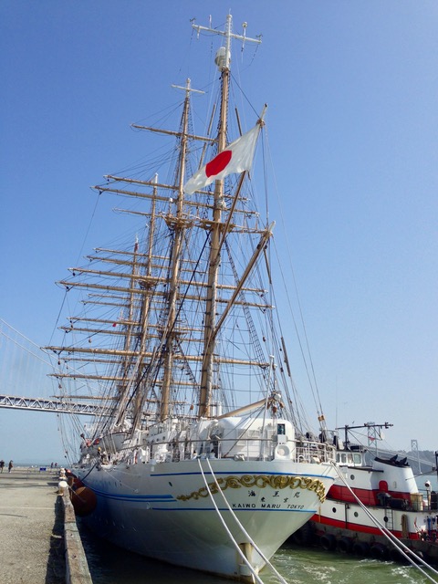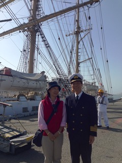 日本の船がサンフランシスコに入港するといつも見物してしまうのですが、故郷日本は島なので他の国との交流は、全部海の向こう "海外" だけあって必ず海を越えなければなりません。 今は飛行機があって約10時間で太平洋を横断できちゃうけど、咸臨丸の頃と同じように海を渡ってやってくるってかえって粋ではないですか。(仕事だからシャーないとか思っている?) かの堀江謙一さんもしかり、船で太平洋横断やっぱりロマンなのだ。 また、地球の7割が海ってこともあるし、海路はその国にとってもとっても重要(デカイ話になってしまったな) というより "綺麗な船だもの♡" という事で、この貴婦人の総取締役(船長さん)との記念に撮った写真。