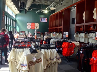 いろんなサイズ、デザインのSFGIANTSのキャップがカウンター越しに陳列されていて、店員さんとの対面販売だ。 商品の並びが整然としているので隣のダッグアウトと大して変わらない値段でも高級品のような気がした。 ユニフォームもいろいろデザインがあり、サイズも豊富に取り揃えてあった "Jersey(ジャージー)" が中心で100ドル前後、素材がしっかりしていいだけにそれなりの値段。