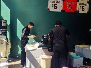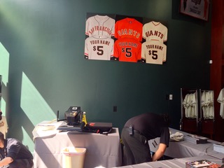 店内のユニフォーム型ジャージーを買い、メンズ用40ドル、女性・子供用15ドルの追加料金で、お気に入り選手の背番号入りユニフォームが作れるという。 一着100ドル前後なので男性用で140ドルくらいになるって事か。