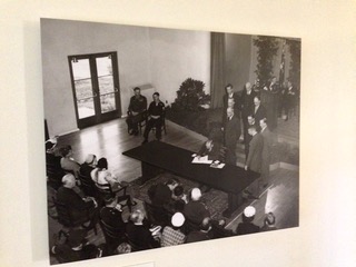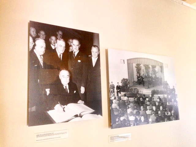 写真の解説では、ボールルームで署名しているとあり、それがこの広い部屋。 左側にはゴールデンゲートブリッジも見え景色がすごくいい。 あのステージの前でアメリカ側はダレス特使をはじめ4名が署名しているにもかかわらず、日本側は、吉田茂首相だけが署名したそうです。 1951年9月8日夕方の出来事。 その日の午前中はオペラハウスでサンフランシスコ講和条約の式典もあった日で、その日1日で戦後の重要な条約が、二つ決まった日なのです。
