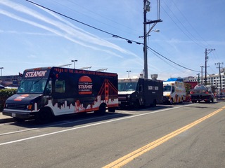 道路には数台のフードワゴンが並んで、パーキングスペースを箱庭みたいにしたパークレット風にして椅子テーブルが用意されている。 カモメもゆったりと入り江で休んでた。 フィッシャーマンズワーフあたりにいるカモメに比べると表情が穏やかなな感じ。