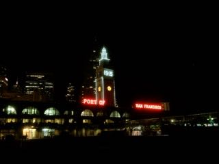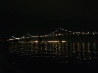 最終のフェリーの後は、ターミナルの人は疎らでレストランも片付け中だった。 土曜日のファーマーズマーケットでは賑やかな場所も静かで、一昨年からの "ベイライト" も来年のスーパーボウルまでの間、補修でライトアップはなくなっていた。 ベイライト前のダークな水面に戻って遠くにオークランド港の灯りがまた分かるようになった。