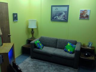 キャンプの二人用テントくらいの大きさ、中は息ができるのかと心配になるほど狭く、窓は開けられない、想像したら息苦しくなり、閉所恐怖症は絶対無理無理のアポロのカプセル。