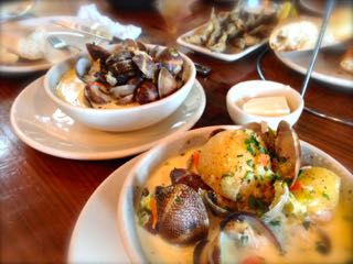 フェリービル内にある "Hog Islad Oyster Co(ホグアイランドオイスター)" 昨年リニューアルオープンしてお店も広くなって少しゆったりした空間になった。 ここのクラムチャウダー($14)は殻付きのアサリを使用、養殖所ならできる贅沢な使い方でたっぷり、一人前を二つに分けてもらった。