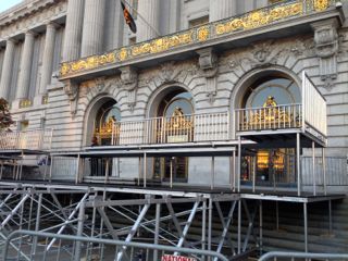 市役所の玄関に足場が設定されている。