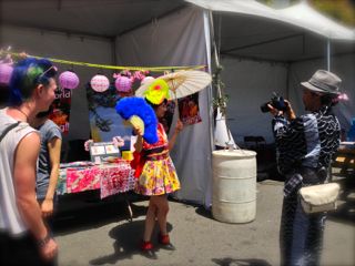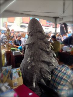 フエルト製ゴジラ君も店番。 アニメキャラクターの出店では、手頃な値段のアクセサリーをお土産に買っている人、真剣にコスチューム選んでいる人‥なかなか興味深し。