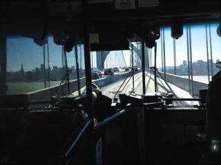 帰りは、元海軍基地ゲートのコーヒーショップ脇のバス停からベイブリッジ上段を通る。 フリーウェイですが、つり革につかまって立って乗るという妙にスリルな初体験もできた‥。